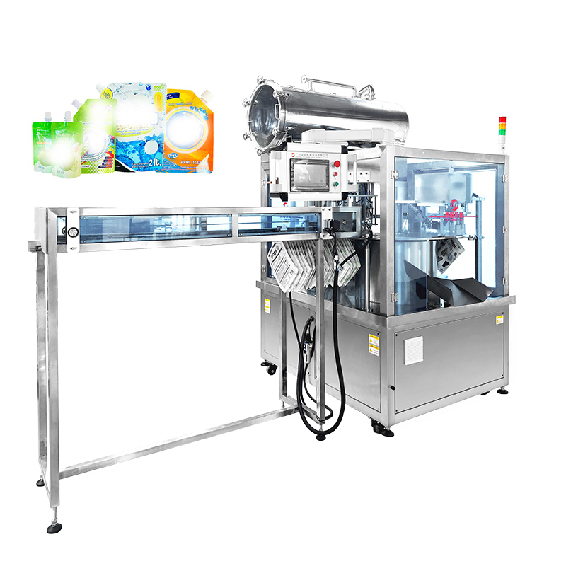 Servo Drive และ Pneumatic Capping ถูกนำมาใช้ Turntable Star Wheel ได้รับการปรับแต่งตามขนาดและขนาดการเปิดกระเป๋าเพื่อให้การเติมและการปรับแต่งสามารถเสร็จสิ้นได้ในเครื่องเดียว มันเป็นอัจฉริยะมีประสิทธิภาพและประหยัดพื้นที่